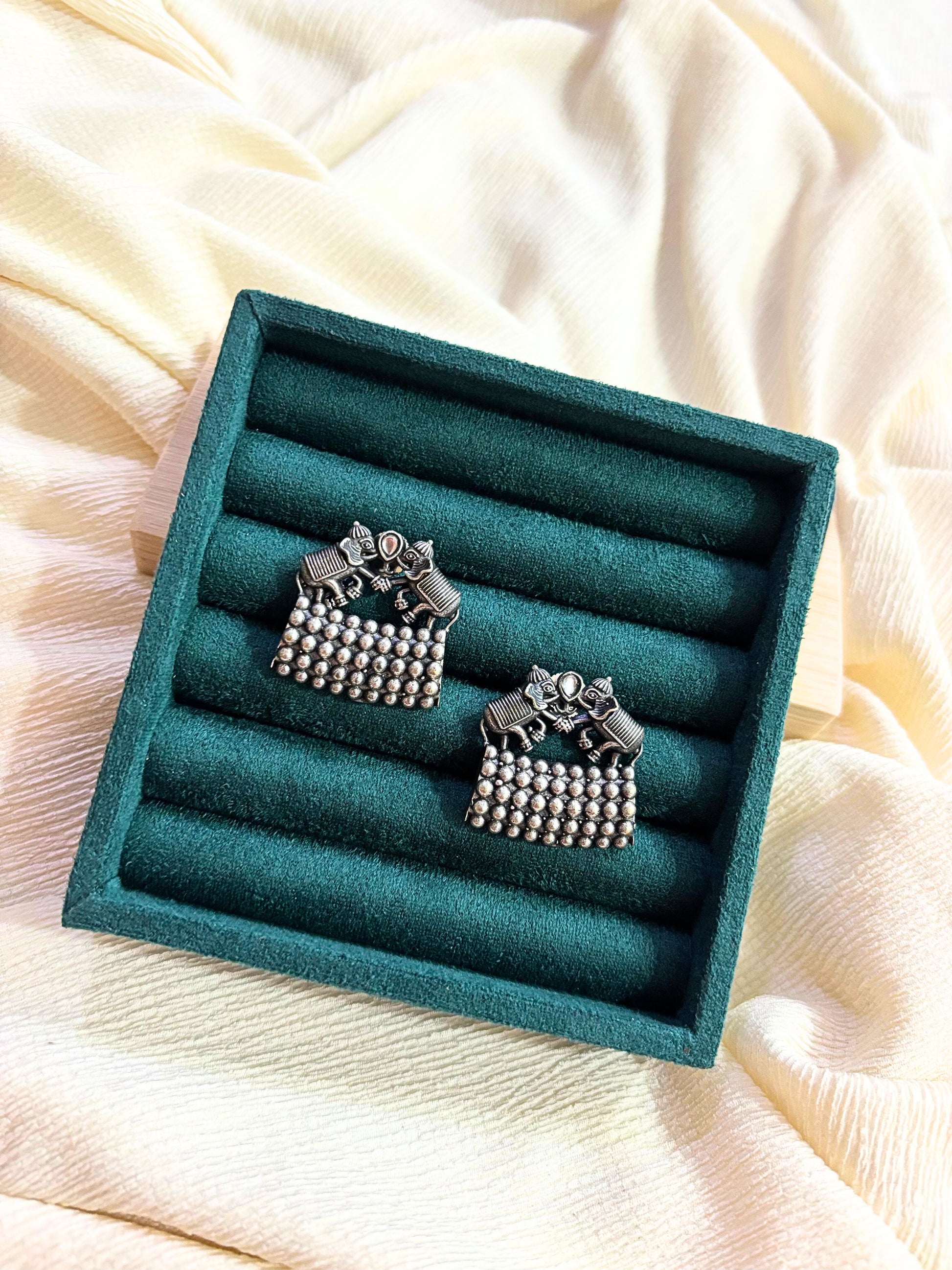 Playful and artistic, these oxidized silver earrings feature two elephants facing each other in a beautifully detailed design, symbolizing friendship, harmony, and celebration.