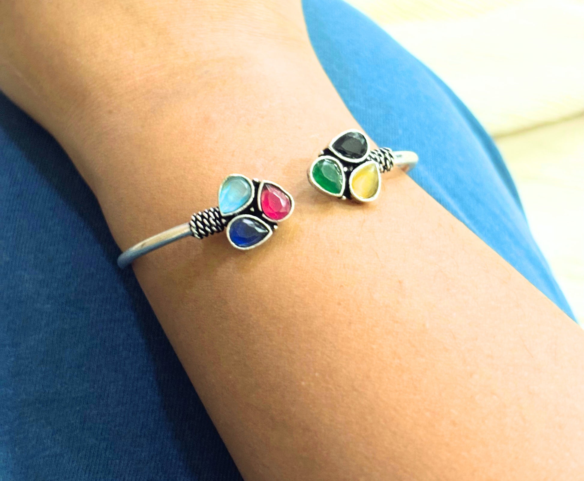 Minimalist yet enchanting, this open kada is adorned with clusters of vibrant gemstone-inspired accents in hues of sapphire blue, emerald green, ruby pink, golden yellow, and onyx black.