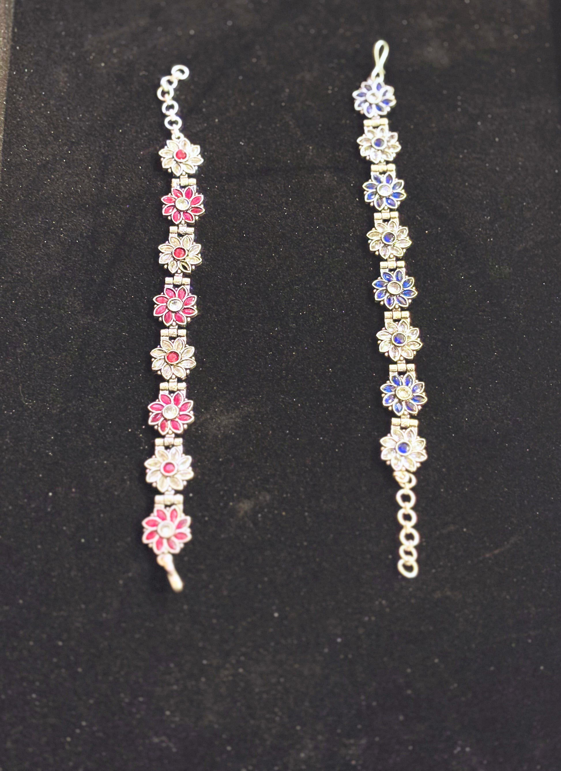 Delicate and enchanting, these bracelets feature a series of intricately crafted floral motifs, highlighted with vibrant enamel accents in shades of ruby pink and sapphire blue. The detailed silver framework adds a timeless elegance, while the playful pop of color brings a youthful charm.