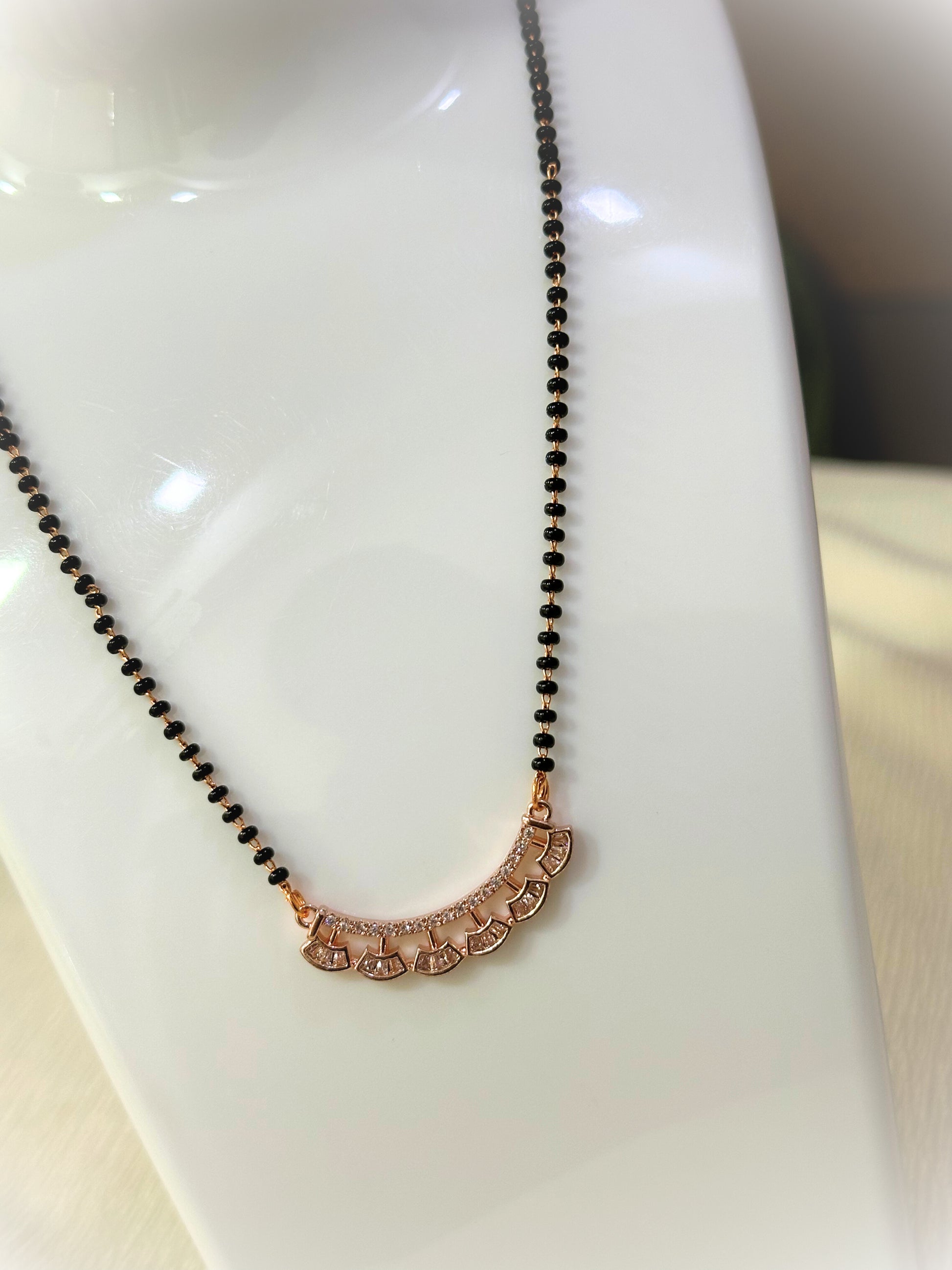 This graceful mangalsutra blends tradition with modern artistry, showcasing a sparkling semi-arc pendant paired with classic black beads—ideal for effortless daily wear.