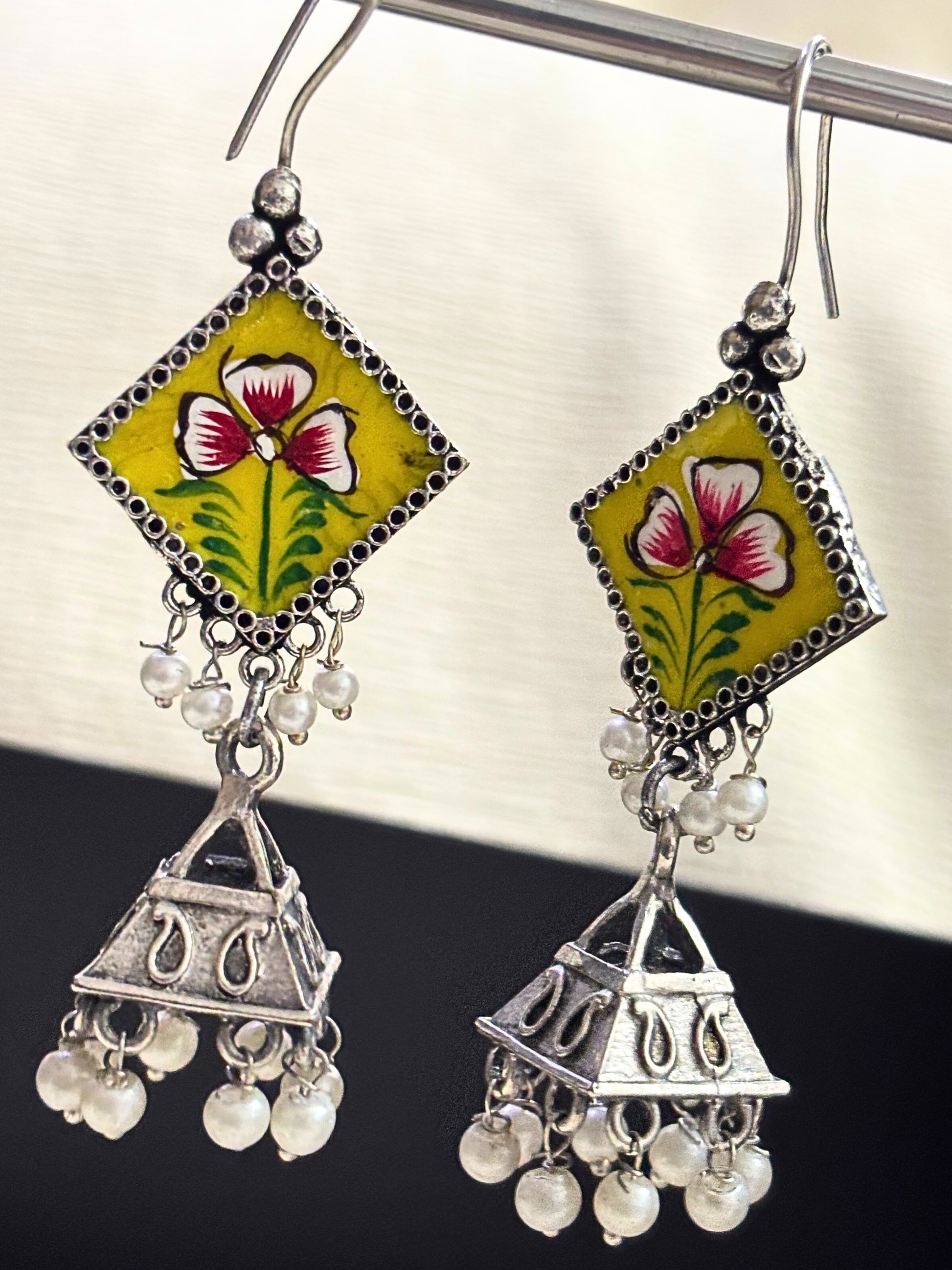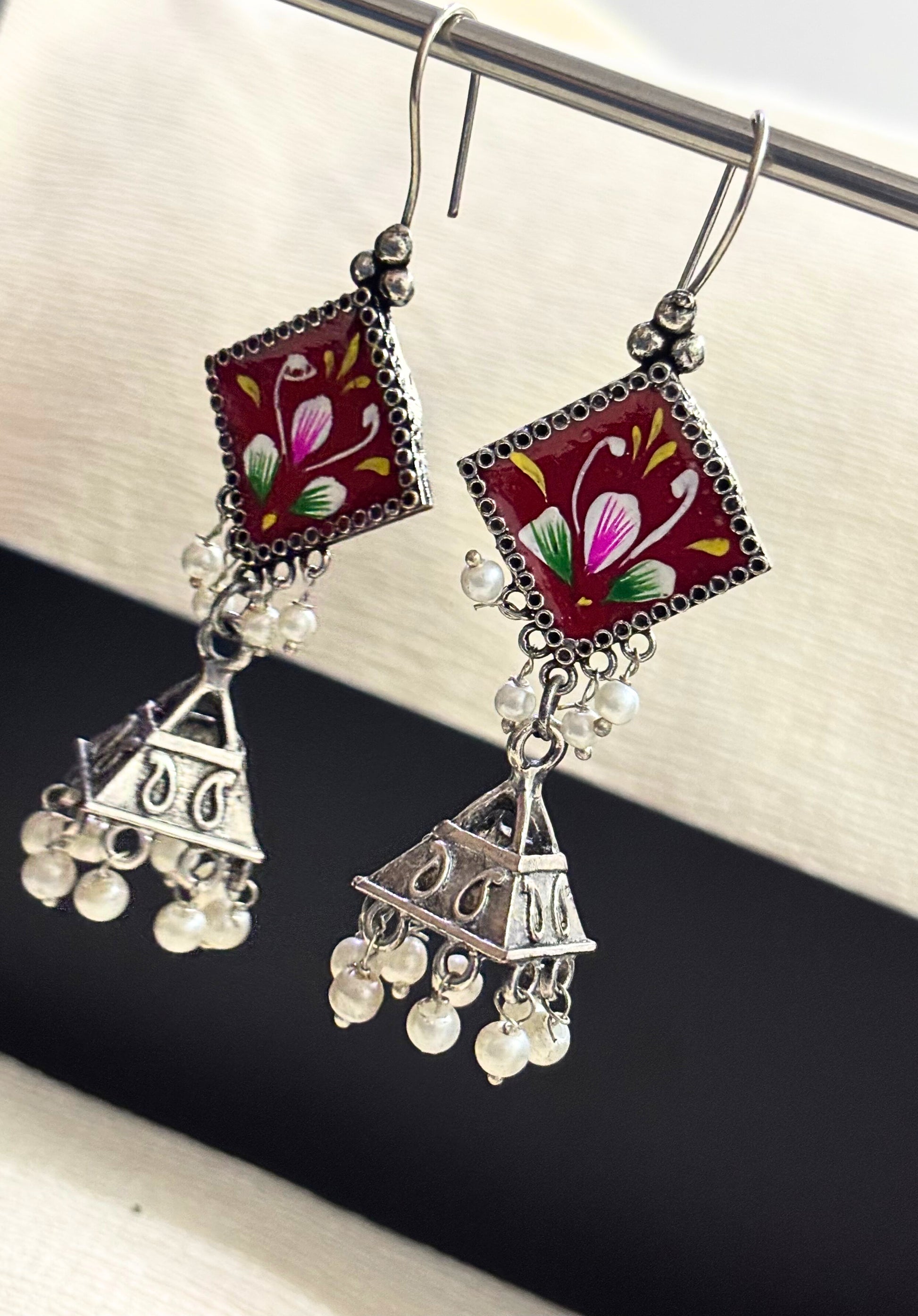 Celebrate timeless artistry with these oxidised earrings featuring vibrant hand-painted floral motifs and intricate jhumka drops. The delicate pearl accents add a graceful touch, making them perfect for festive wear, cultural occasions, or to add a pop of heritage elegance to any outfit.