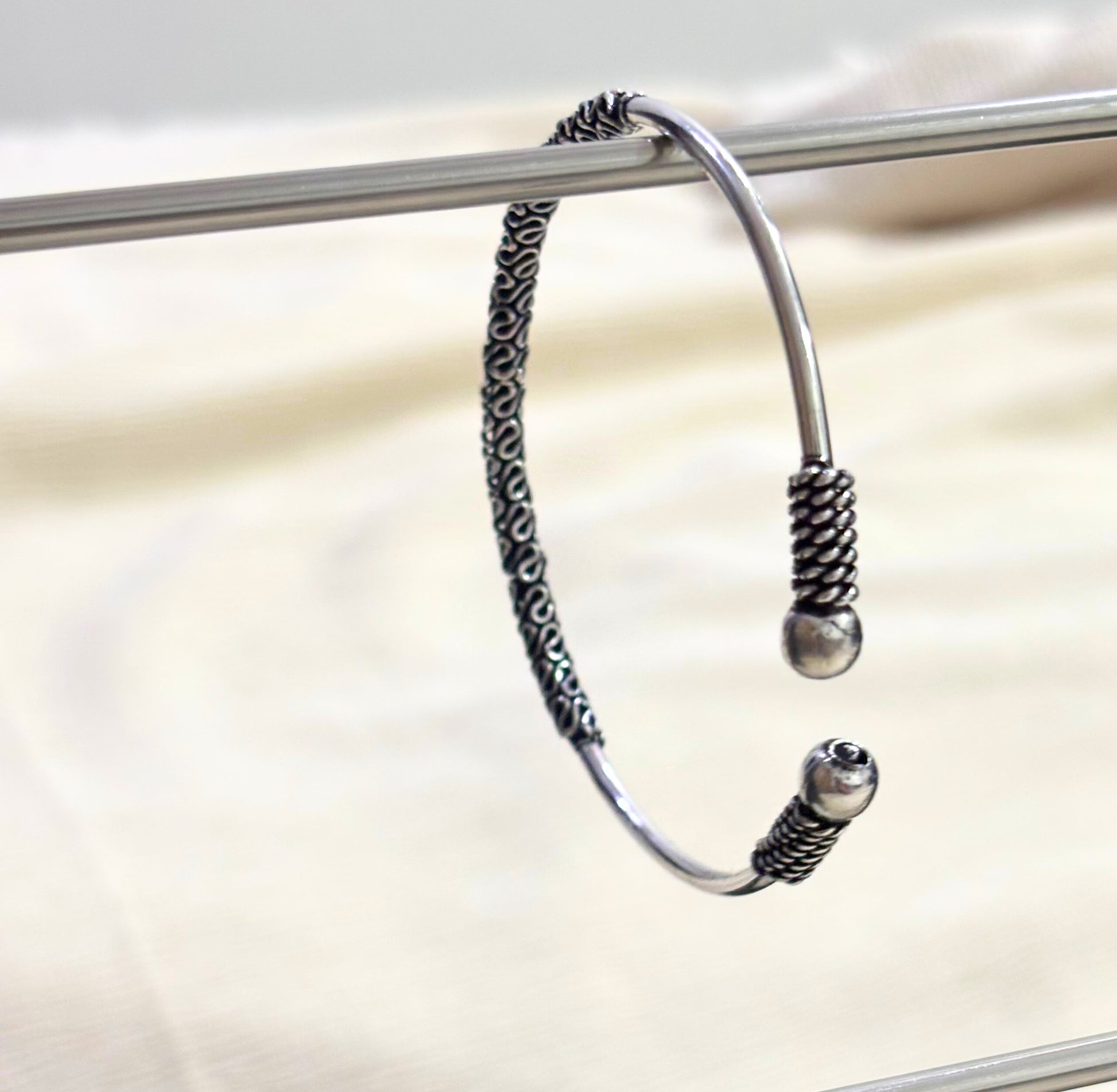 Elegance lies in simplicity, and this oxidised open cuff bracelet is the perfect example. Crafted with intricate detailing along the band and finished with textured end caps, it blends traditional artistry with a sleek, modern appeal.