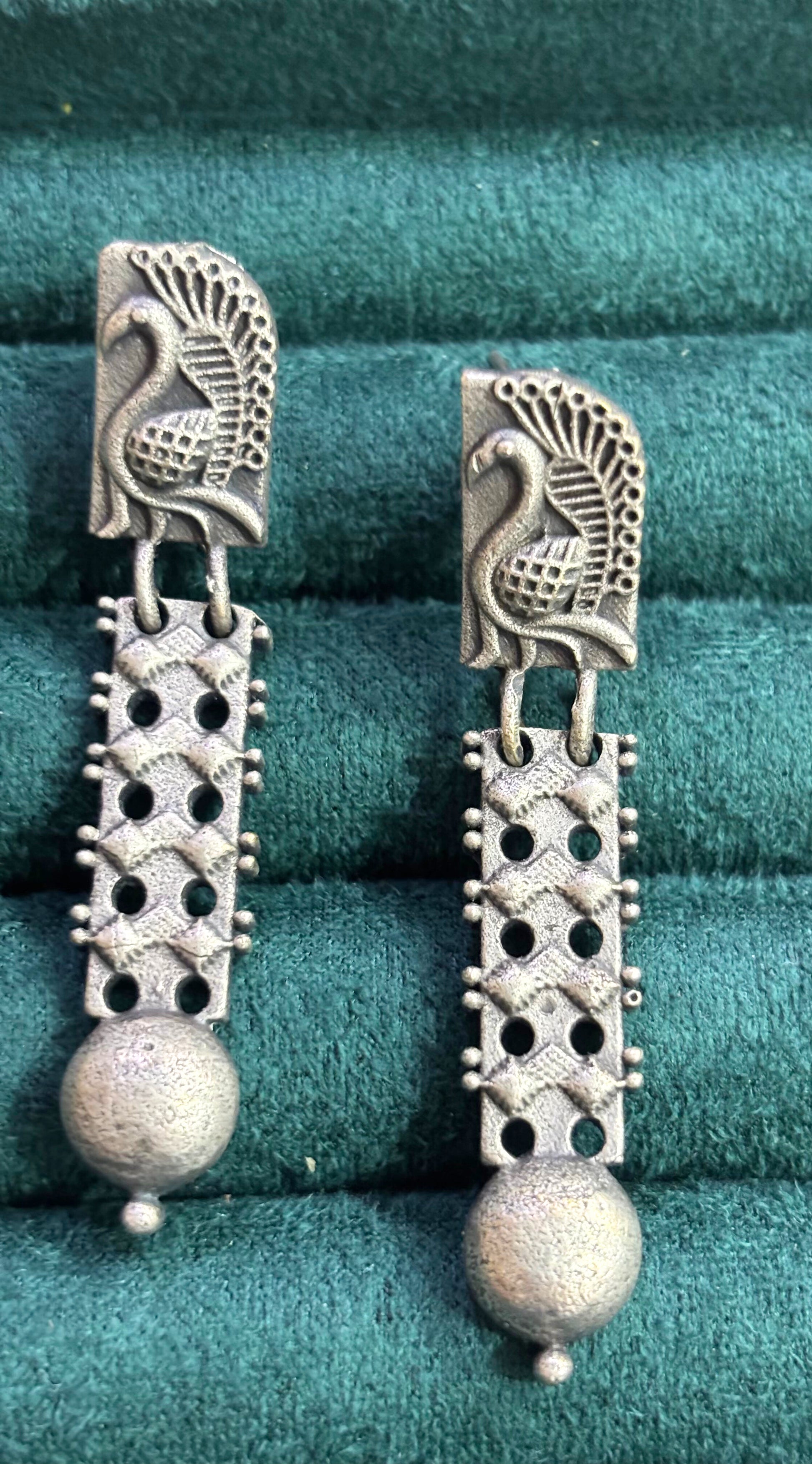 Inspired by timeless artistry, these Oxidised dangler earrings feature an intricate peacock motif with a detailed handcrafted design. The antique finish and elegant drop style make them a versatile choice—perfect to pair with sarees, kurtas, or even Indo-western outfits.