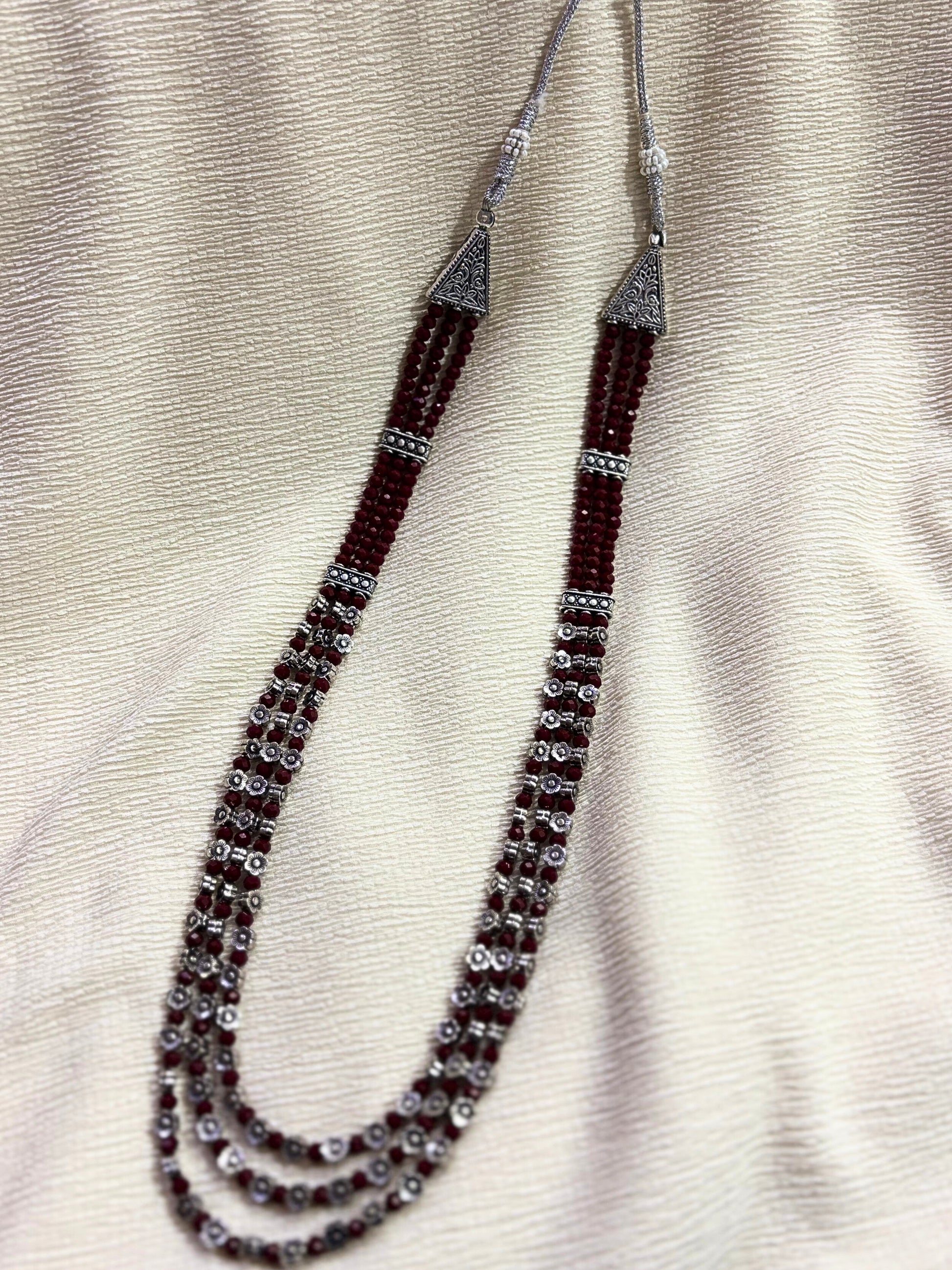 A perfect blend of tradition and elegance, this oxidised necklace set features deep maroon beads gracefully layered with antique silver detailing. The intricate oxidised accents add a royal touch, making it an ideal choice for festive occasions, weddings, or cultural celebrations.