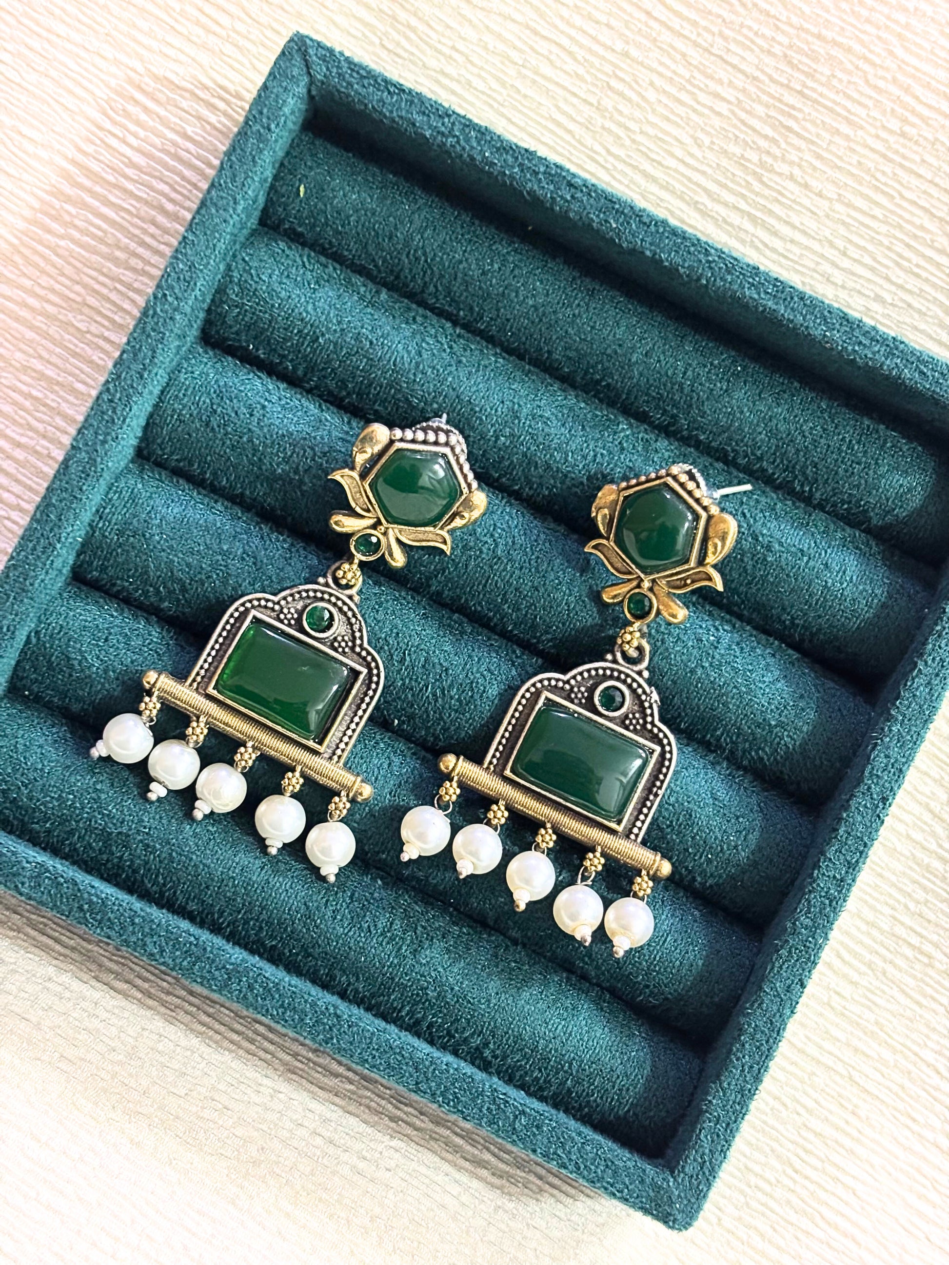 Elevate your traditional look with these exquisite oxidised earrings featuring deep green stone accents and delicate pearl danglers. The intricate design blends vintage elegance with timeless charm, making them perfect for festive occasions, weddings, or a regal everyday statement.