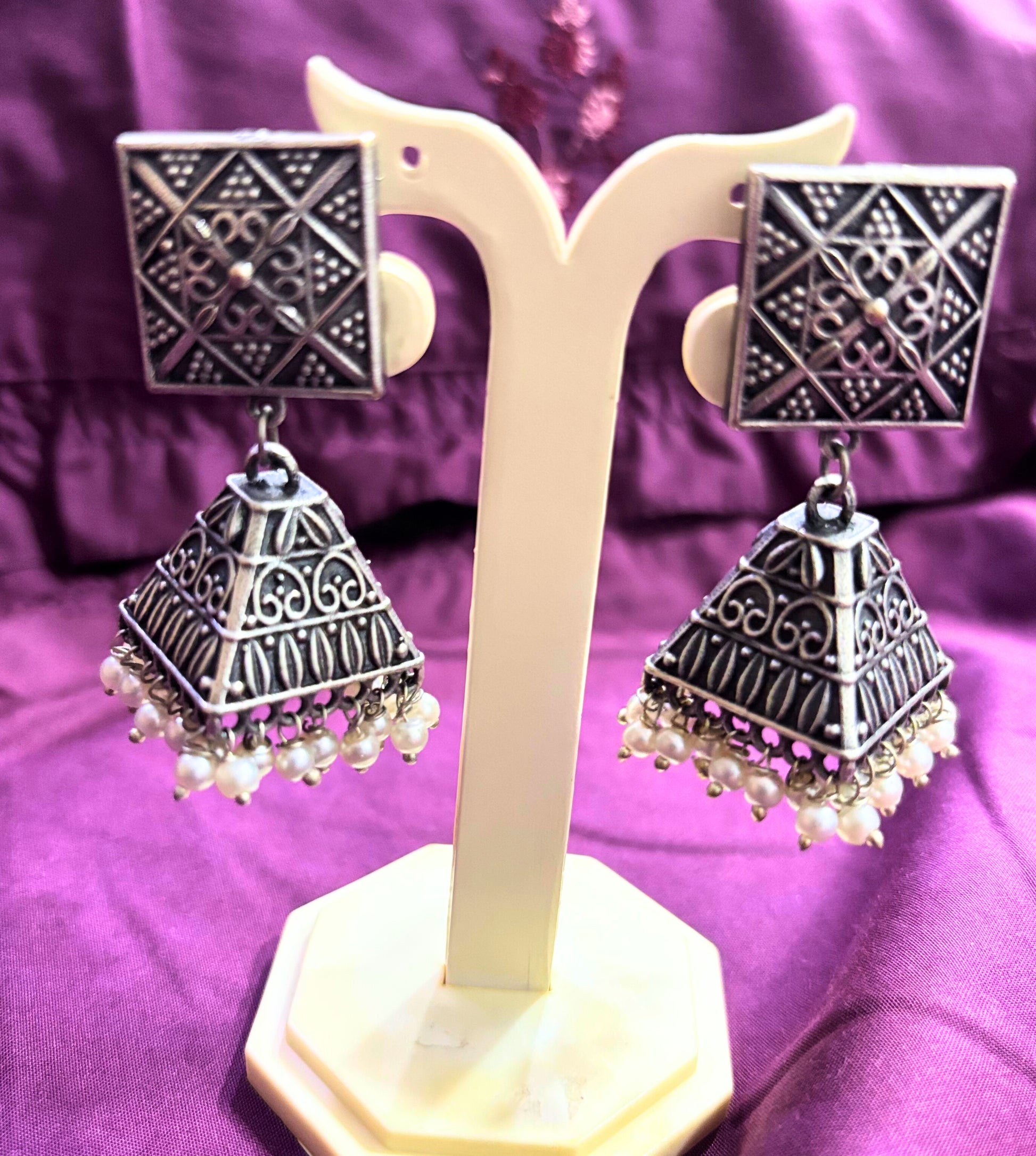 Embrace the grace of heritage with these oxidised pyramid jhumkas, featuring intricate temple-inspired carvings and delicate pearl danglings. The bold square stud top complements the geometric pyramid drop, creating a perfect fusion of tradition and modern artistry.