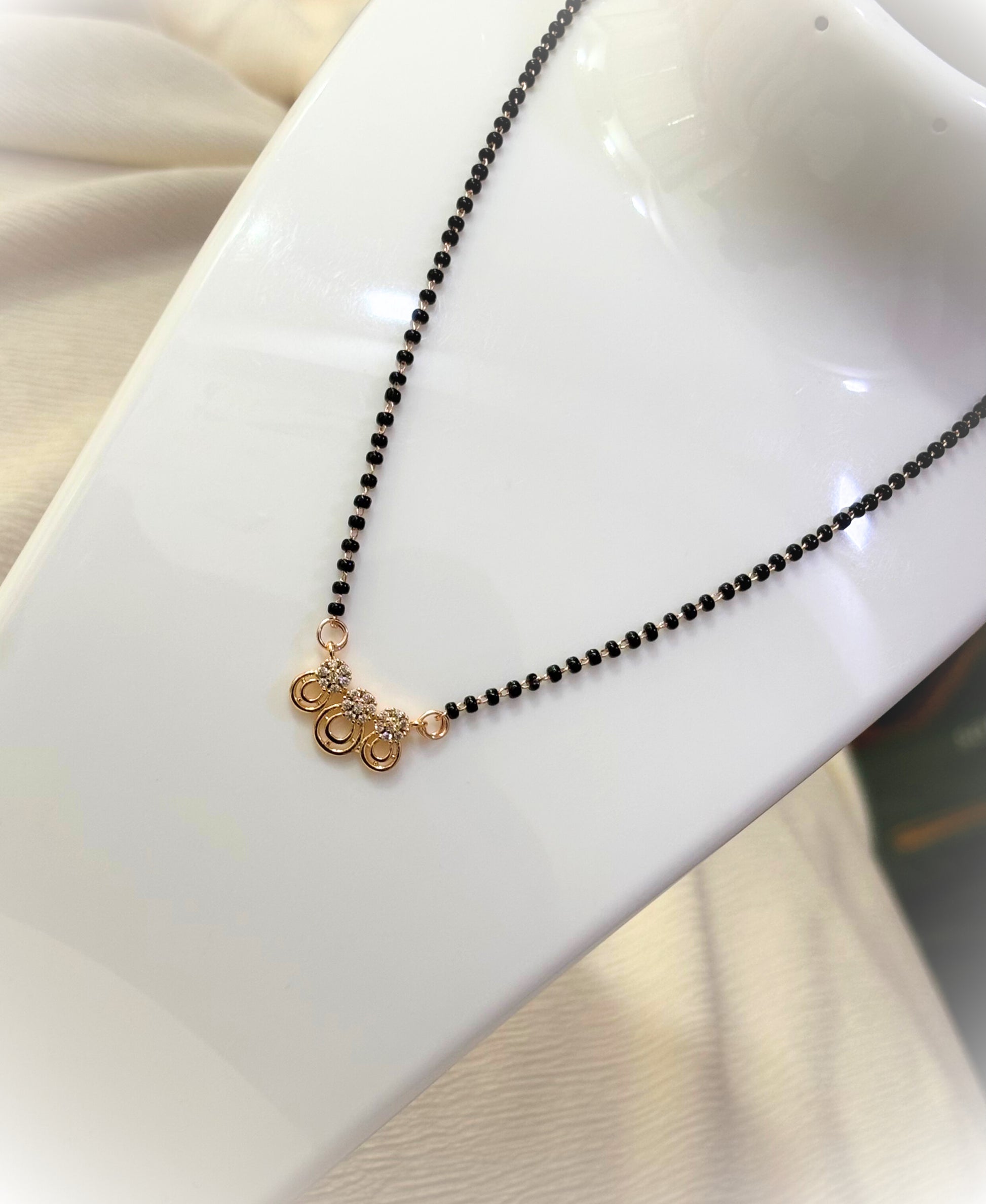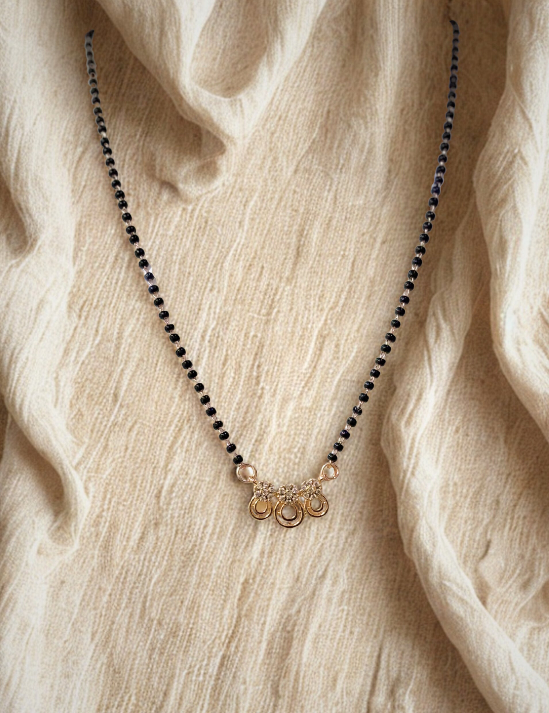 A charming mangalsutra featuring three delicate gold loops topped with sparkling floral motifs, blending tradition with a touch of modern elegance. Perfect for everyday wear.