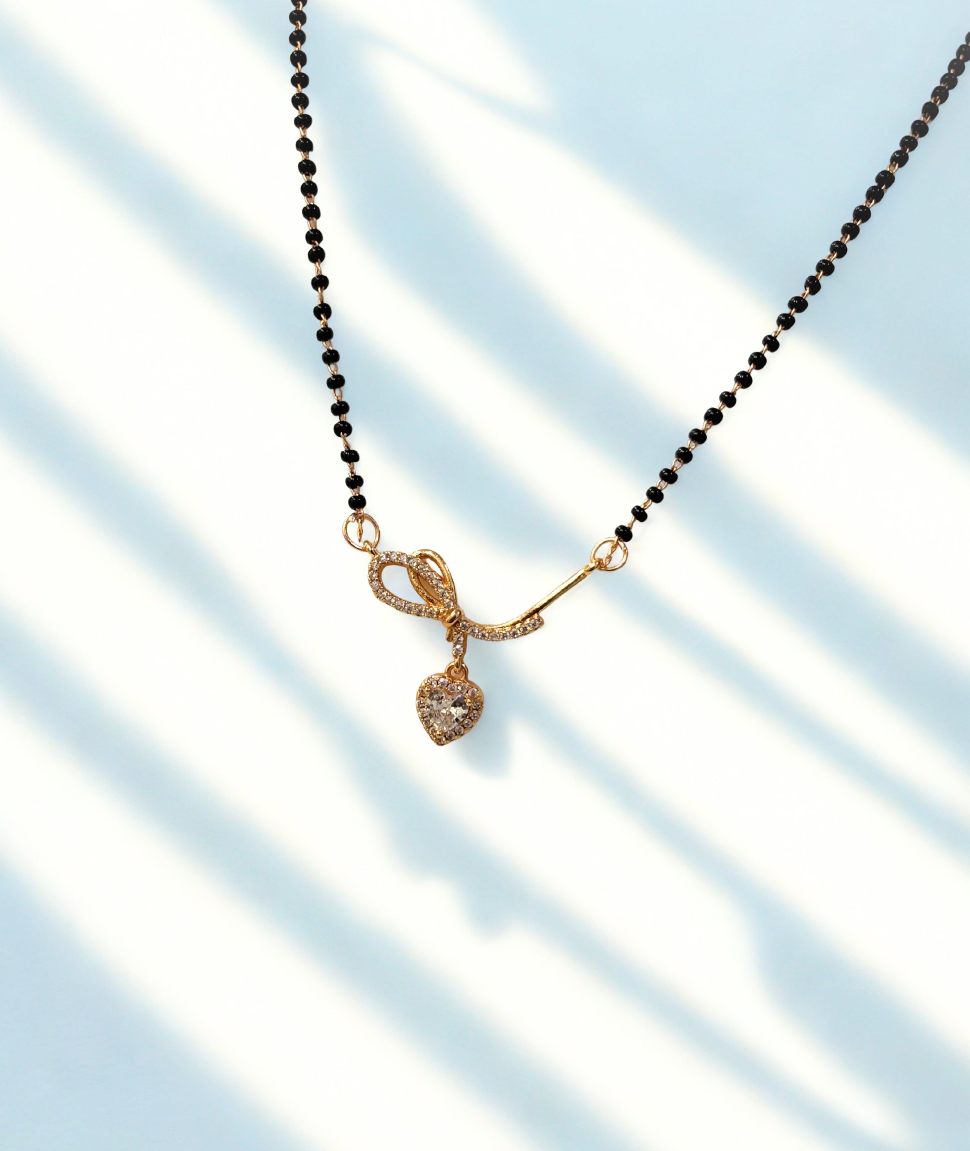 A beautifully crafted mangalsutra featuring a graceful love-knot design with sparkling stones and a dainty heart drop—perfect for adding everyday elegance with a romantic touch.